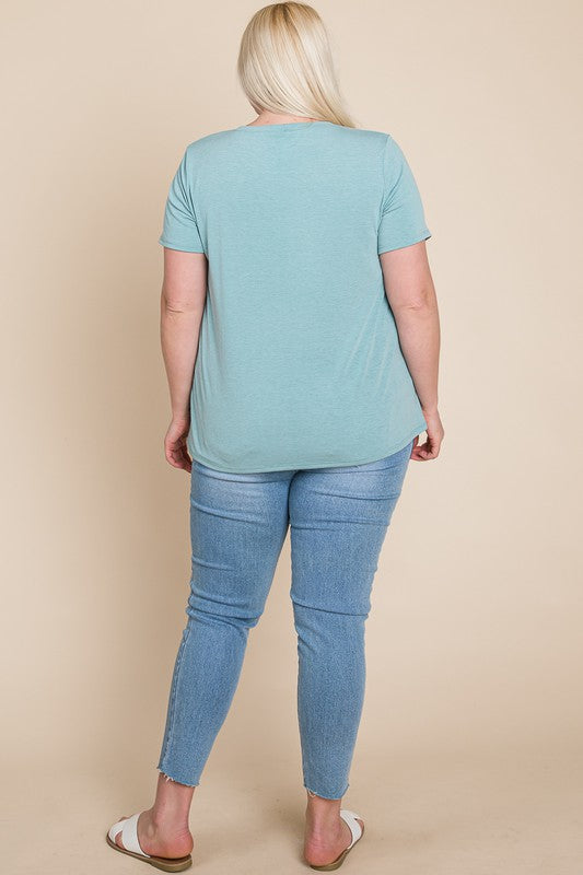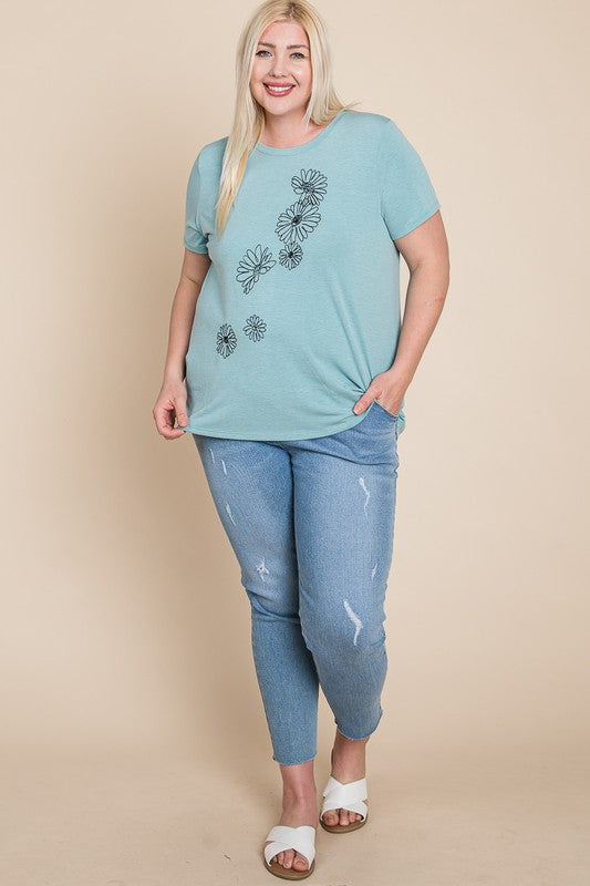 Plus Size Solid Casual Short Sleeve Top with Floral Embroidery Detail 62% Polyester 34% Rayon 4% Spandex Made in USA