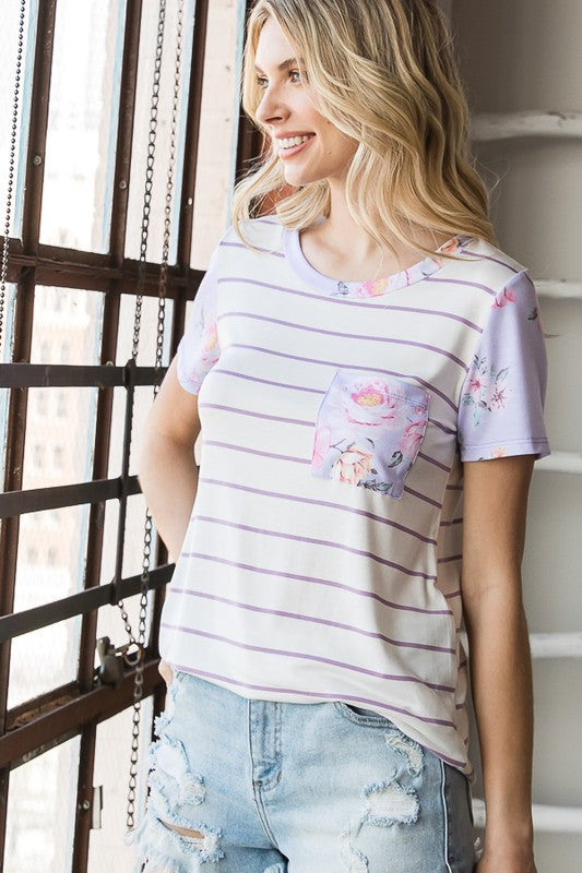 A STRIPE KNIT TOP FEATURING A FLORAL CONTRAST, ROUND NECK, SHORT SLEEVES, AND CURVED HEM. *MODEL IS WEARING SIZE SMALL